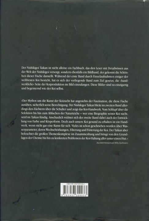 Der Nishikigoi Taikan ist nicht alleine ein Fachbuch, das den Leser mit Detailwissen aus der Welt der Nishikigoi versorgt, sondern ebenfalls ein Bildband, der gekonnt die Schönheit dieser Fische darstellt. Während der erste Band durch Einzelaufnahmen einiger der weltbesten Koi besticht, hat es sich der vorliegende Band zum Ziel gesetzt, die -handwerkliehe- Seite der Koiproduktion im Bild einzufangen. Diese Bilder sind so einzigartig und begeisternd wie der Koi selbst. -Der Mythos um die Kunst der Koizucht hat angesichts der Faszination, die diese Fische ausüben, sicherlich seine Berechtigung. Der Nishikigoi Taikan blickt im zweiten Band allerdings den Züchtern über die Schulter und zeigt das Koi-Handwerk. Vom Schlupf über die Selektion bis hin zum Abfischen der Naturteiche - wer eine Biographie seiner Koi sucht, wird im Taikan fündig. Anschaulich widmet sich der zweite Band dabei auch der Entwicklung von Farbe und Körperform. Doch auch unsere Koi gesund zu erhalten ist ein Handwerk, wenn nicht gar eine Kunst für sich. Vieles ist schon geschrieben worden über Wasserparameter, deren Wechselwirkungen, Filterung und Fütterung der Koi. Der Taikan aber beleuchtet die großen Themenkomplexe im Zusammenhang und bringt von den Grundlagen der Chemie bis hin zu konkreten Problemen der Koi-Haltung alles unter einen Hut.- Aus dem Vorwort von Willy Quillmann